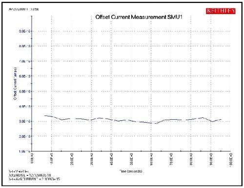 將系統配置為進行超低電流測量的前幾步之中有一步是確定整個測量系統的偏移和漏泄電流,包括4200-SCS本身、連接電纜、開關矩陣、測試夾具和探針。這可確定整個系統的噪底限值,并設置一個開始點,如果可能的話則進行改進。從測量源測量單元(SMU)的偏移開始,然后繼續增加測量電路組件,直到連接了除被測裝置(DUT)之外的全部組件。直接由帶有4200-PA遠程前置放大器的4200-SMU利用KITE軟件進行測量。