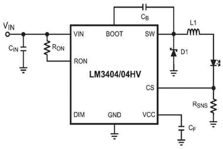 VIN:輸入端,電壓范圍6~42V,對于LM3404H范圍為6~75V.