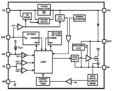 此外,這款芯片可以利用低至0.2V的反饋電壓提供電流檢測功能。輸入電壓6~42V,其內部電路結構如圖5所示。