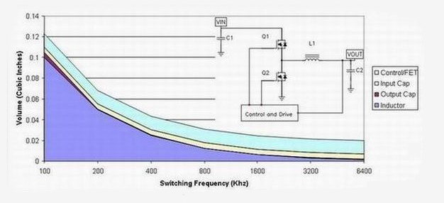 我們以濾波器組件作為開始。這些組件占據了電源體積的大部分,同時濾波器的尺寸同工作頻率成反比關系。另一方面,每一次開關轉換都會伴有能量損耗;工作頻率越高,開關損耗就越高,同時效率也就越低。其次,較高的頻率運行通常意味著可以使用較小的組件值。因此,更高頻率運行能夠帶來極大的成本節約。