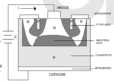 當(dāng)一個(gè)反向偏壓加到PN結(jié)的陰極和陽極時(shí),這個(gè)恒流二極管開始導(dǎo)通,當(dāng)反向偏壓增加到VL時(shí)(見圖2),其電流由于N區(qū)的體電阻也跟著增加,當(dāng)電流增加到曲線的拐點(diǎn)時(shí),在N區(qū)和P型柵之間形成一個(gè)耗盡層。這個(gè)耗盡層減小了N區(qū)中電流的路徑也就減慢了電流的增加速度。結(jié)果這個(gè)耗盡層遇到了P型柵于是就產(chǎn)生了夾斷效應(yīng),這使得電流變成恒定而幾乎和所加電壓無關(guān),直到所加電壓達(dá)到一個(gè)擊穿點(diǎn)Vb。如果所加電壓反過來,那么就相當(dāng)于一個(gè)正向電壓加到一個(gè)PN結(jié),其特性就和一個(gè)普通二極管加上正向電壓時(shí)一樣。