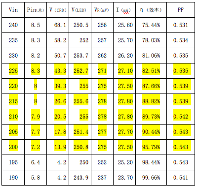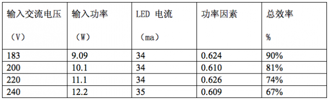 下面舉一個(gè)實(shí)測的結(jié)果為例,這是一個(gè)80顆3014串聯(lián)的球泡燈,采用了5顆Semitek 的S-562T并聯(lián)。它在不同的輸入市電電壓時(shí),所測得的結(jié)果如下表所示。