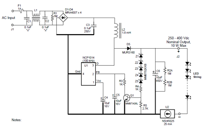 美國安森美公司加了一個(gè)功率因素校正芯片NCP1014的恒流二極管的電源,其電原理圖見圖12。