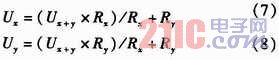 如圖2所示,U+和U-為被測線路的母線供電電壓,正常工作時兩母線間的電壓差Ux+y為440 V,且隨蓄電池內阻變化。Rx,Ry分別為被測線路的正母線絕緣電阻和負母線絕緣電阻。正、負母線絕緣電阻反映的是64路的正、負支路的總體絕緣性能,等效于各個支路的正、負絕緣電阻的并聯(lián),正常時兩母線絕緣電阻>20 kΩ。Ux和Uy為正負母線對地電壓,大小隨正負母線的絕緣電阻變化,但兩母線電壓差恒定為Ux+y。為了檢測正負母線電壓Ux,Uy,Rx,Ry,系統(tǒng)采用了“平衡-不平衡檢測法”檢測母線電壓和母線絕緣電阻。計算公式如式(1)所示。