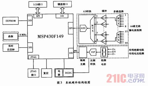 直流接地檢測系統(tǒng)采用低功耗處理器MSP430F149為硬件核心,外圍電路可分為數(shù)據采集模塊、人機交互模塊、處理器模塊。數(shù)據采集模塊負責檢測64路支路的漏電流、母線電壓、母線絕緣電阻;人機交互模塊負責進行液晶顯示和鍵盤輸入;處理器模塊負責協(xié)調整個系統(tǒng)的數(shù)據處理,數(shù)據存儲,人機交互等。具體的硬件結構框圖,如圖3所示。