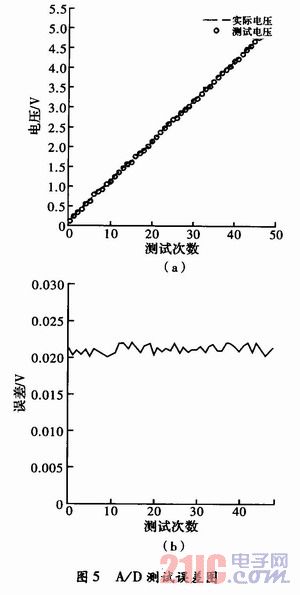 為了達到好的測試效果,A/D采集必須達到一定的測試精度,圖5是A/D采集的實測數(shù)據和測試誤差分析曲線,從圖中可以看出,A/D采集的誤差約20 mV,屬于正常范圍,因為系統(tǒng)采用8位A/D,5 V基準電壓。這個采樣精度滿足整體的設計要求。