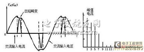 (a) 電網輸入端電流和電壓的畸變 (b)峰值電流中的各次諧波分量頻譜