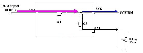 假設使用5.5V電源供應器對單顆1200mAh鋰離子電池進行充電,在0.7°C快速充電電流時,且電池電壓為3V的條件下,可以預估IC運作的最大耗電量為,1.762W的耗電最大值,此一功耗會使得熱阻抗60°C /W的3×3毫米QFN封裝溫度溫升127°C,即便環境溫度0°C時,也已經超過所允許的125°C硅晶片操作溫度最大值。若設定充電電流為0.6A(0.5C),則可降低IC溫升為90度,可以操作于35度的環境溫度中,因此是較佳的設定電流。