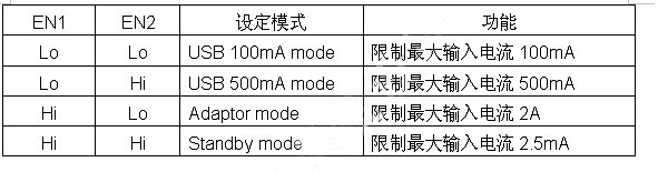 LD6275將電源適配器/USB埠的5V直流電源進行降壓穩流,對鋰離子電池進行充電,為防止電源適配器的過電流超載,可以外部電阻RCISET設定最大充電電流限制。同時支援電腦USB埠充電模式,并依據外部腳位EN1與EN2進行設定,各模式請見表1.透過為USB 500mA與USB 100mA操作模式設定,可以保護PC端USB埠避免過載。