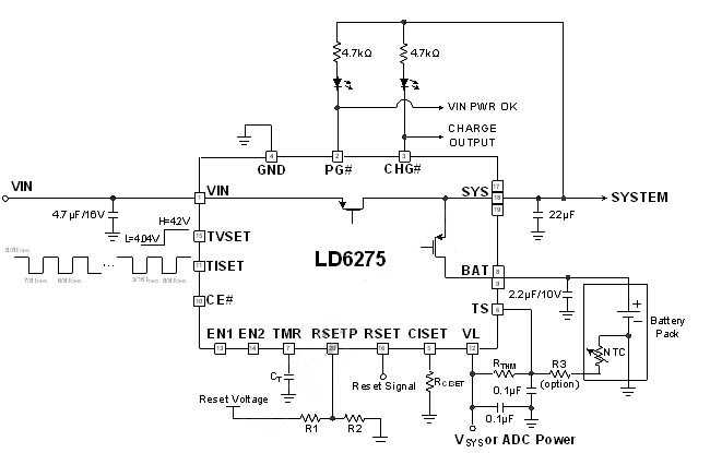 為滿足低耗電可攜式產品對于更精確、更安全的充電器應用需求,許多IC制造商發展出低成本線性充電器。圖2是以通嘉科技的LD6275充電IC為設計范例,構成僅需少數外部零件的獨立式線性充電器電路,其具備1.5A的最大充電電流。