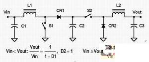 圖1a的電路盡管是四個(gè)電路中最復(fù)雜的,卻有幾個(gè)優(yōu)點(diǎn)。它的輸入和輸出電流被電感平滑處理,減小了輸入和輸出端的紋波電流以及對電容C1和C3的電流應(yīng)力。但是這一方案也有缺點(diǎn),電容C2的電流不管是當(dāng)Vin小于Vout時(shí)來自CR1還是當(dāng)Vin大于Vout來自S2,它都會(huì)有中斷,而且它需要兩個(gè)電感。