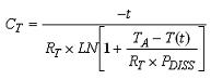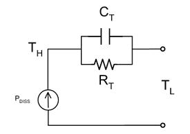 該模擬可以深入進行,以描述器件的另一個熱屬性,稱之為熱容。正如將熱阻模擬為電阻,可以將熱容(CT,單位為J/℃)模擬為電容。將熱容與熱阻并聯獲得熱阻抗(ZT)。圖1所示為傳導傳熱的簡化RC模型。能源被模型化為電流源,熱阻抗被模型化為CT與RT并聯。