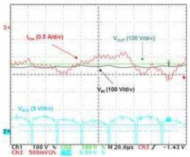 因此,輸出電壓呈現(xiàn)出輸入線路頻率2倍的低頻交流含量。不利的是,PFC電流整形(current-shaping)方法均基于控制信號(hào)無紋波的假設(shè)。否則,就不能夠優(yōu)化功率因數(shù),因?yàn)檩斎刖€路電流重新復(fù)制了控制信號(hào)失真。這就是眾所周知的PFC電路動(dòng)態(tài)性能差的原因。它們的穩(wěn)壓環(huán)路帶寬設(shè)得極低,從而抑制100Hz或120Hz紋波,否則輸出電壓就會(huì)注入這紋波。