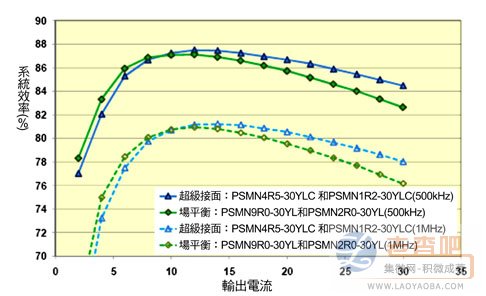 從上述中可知,控制FET的開關速度可能會受到QGD以外的其他因素限制。可從圖7明顯看出,低RDS(on)同步FET(PSMN1R2-30YLC)與中等RDS(on)同步FET(PSMN4R5-30YLC)的開關波形的比較。在這兩個例子中,PSMN4R5-30YLC均作為控制FET。可明顯地看出,開關節點(即控制FET和同步FET形成的半橋中點)的上升時間與控制FET無關。換言之,開關節點電壓上升所導致的導通損耗不再受控制FET的QGD限制。