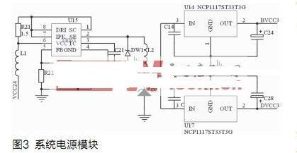 控制單元內部單片機的供電為3.3V,其他芯片和模擬器件的供電在3V到10V之間。控制單元的電源輸入是由外部開關電源提供的。在生產現場,開關電源與水泵電機共用一路交流電,水泵在運行過程中會引起開關電源的輸出波動,若不采取防浪涌措施勢必會影響到單片機的正常工作。根據上述分析設計系統電源模塊如圖3所示。電感L1起防浪涌保護作用;輸入電壓經開關電源芯片MC34063后輸出12V電壓,然后通過兩個NCP1117ST33穩壓芯片產生兩路3.3V電源分別給單片機和光電接收電路供電。