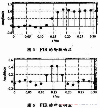 點(diǎn)擊“design filter”即可。值得注意的是,這里選擇filter order為15階,而不是所設(shè)計(jì)的16階濾波器。因?yàn)槌?shù)系數(shù)項(xiàng)h(0)=0。通過(guò)菜單“analysis”選擇“magnitude”和“phase response”即可得到圖3,圖4的特性顯示。“analysis”選擇“step response”和“im-pulse”可以得到圖5,圖6的響應(yīng)顯示。可以看出所設(shè)計(jì)FIR濾波器的階躍響應(yīng)和沖擊響應(yīng)比較接近理想狀態(tài)。
