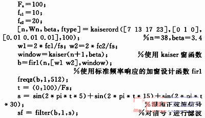 Matlab信號(hào)處理工具箱提供了各種窗函數(shù)、濾波器設(shè)計(jì)函數(shù)和濾波器實(shí)現(xiàn)函數(shù)。設(shè)計(jì)中利用Matlab提供的函數(shù)firl來(lái)實(shí)現(xiàn),編程則是直接調(diào)用這些函數(shù)簡(jiǎn)單直觀的完成設(shè)計(jì)。調(diào)用格式:firl(n,Wn,‘ftype’,Window),其中n為階數(shù)、Wn為截止頻率、ftype是濾波器的類(lèi)型、Window是窗函數(shù)。應(yīng)用凱塞窗的代碼如下: