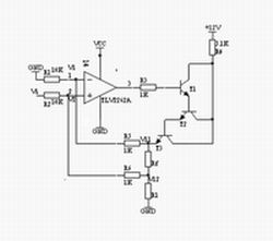 顯示模塊主要實現的功能是顯示設置的電流輸出值和其它人機交互信息。本部分可以采用七段數碼LED顯示器,顯示數字、簡單字母和小數點等信息,但由于其顯示信息單一,人機交互不友好,本文采用字符型液晶顯示屏LCDSMC1602A模塊。該模塊具有輕薄短小、低壓微功耗、體積小、無輻射、平面直角顯示及影像穩定不閃爍等優點,且可視面積大、面效果好、分辨率高、抗干擾能力強,適合用于顯示字母、數字、符號等信息,而且不需要擴展過多外圍電路,可由單片機直接進行控制輸出顯示。電壓-電流轉換模塊由精密運放與三個晶體管組成的達林頓管電路構成。轉換電路利用晶體管平坦的輸出特性和深度負反饋電路使輸出電流穩定,如圖2所示,此V/I轉換電路的帶負載能力強,電流輸出范圍達0~3A。輸出電流Io經反饋電阻Rf得到一個反饋電壓Vf,Vf= V11-V12,通過R5、R6加到運算放大器的兩輸入端,設運放兩端的電為V1、V2,Vi由單片機DAC輸出。因為理想運放的輸入電流約等于零,且 V1=V2,則:
