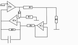 電壓-電流轉換模塊還有另外一種方案,即采用三個運放構成輸出電流可變的電流源,如圖3所示。輸出電流I=Vi/R1,為使R1兩端的電壓保持恒定,由差分放大器IC1b通過射隨器IC1c監測R1兩端的電位,此電位經IC1b的7腳加到比較器 ICa的反相輸入端與Vref比較,根據比較結果使比較器的輸出端變化,直到平衡為止,即Vr1=Vi。電路中的電容用于補償ICa的頻率,減少控制環路的延時。只要R1=R2=R3=R4=R5,此電路的性能較好,但帶負載能力不強,環路延時補償對電路的穩定有較大影響。