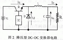 圖2所示為降壓型DC-DC變換器的典型電路,當(dāng)控制器IC感應(yīng)到輸出電壓Vo太低時(shí),啟動(dòng)通道上的晶體管Q給電感器L充電,同時(shí)也對電容器C充電,當(dāng)輸出電壓V0上升到一個(gè)預(yù)定值時(shí),控制器關(guān)閉通道上的晶體管Q,電感器L和電容器C上獲取的能量通過肖特基二極管構(gòu)成的回路自由釋放,從電感器L到電容器C進(jìn)行有效的能量傳輸會(huì)消耗一部分能量,因此加載在負(fù)載上的電壓有所下降。