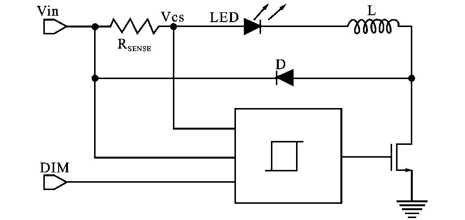 滯流控制模塊內部電路如圖2 所示,當DIM 信號為高電平期間,當Vcs 大于上電壓閾值時,控制電路輸出低電平,關閉功率開關管。 由LED、電感L 、續流二極管D 和RSENSE組成的回路使得電感繼續為L ED 提供電流,電感電流逐漸減小,使得檢測電壓Vcs 隨之減??;當Vcs 小于下閾值電壓時,控制電路輸出高電平,導通功率開關管,此時D 截止,形成從電源經RSENSE、L ED、L 和功率開關管到地的回路,電源為電感L 充電,電感電流上升,檢測電壓Vcs隨之升高。 Vcs 大于上電壓閾值時,控制電路關斷開關管,重復上個周期的動作,這樣就完成了對L ED驅動電流的滯環電流控制,使得流過L ED 的驅動電流,也就是電感電流的平均值恒定。