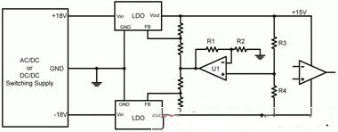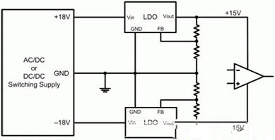 圖2顯示了一個典型運算放大器電源電路的示意圖。此處,一個開關電源提供一個正18V和一個負18V。兩低壓降(LDO)線性穩壓器進一步將±18V調節至±15V。該LDO一般安裝在電源和運算放大器之間,旨在降低開關電源產生的高頻開關噪聲。LDO具有較高的電源抑制(以比率表示,PSRR),其減弱了寬帶頻率下LDO輸入的噪聲。