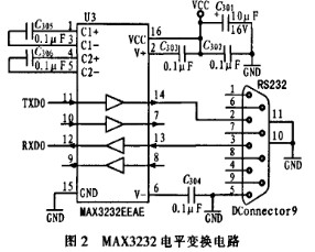 系統產生的信號需要經過電平變換,轉換成RS-232電平,與計算機通信。這里采用MAX3232為核心電平變換電路。其原理圖如圖2所示。