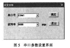 要實現計算機串行通信的功能,一種較為簡便的方法是使用MSComm(Microsoft Communication Control)通信控件,它提供了標準的事件處理函數過程,是微軟公司開發的專門用于串行通信的控件。它是高級語言編寫的串行通信程序和PC串口之間的橋粱。本系統采用得就是這種方法。設置控件的屬性。添加控件的響應代碼。就可以使串口按照要求進行工作。在這個界面,可以進行串口號和波特率的設置。通信參效設置界面如圖5所示。
