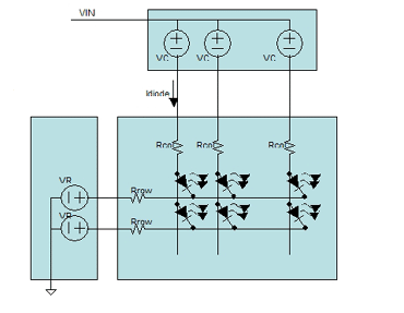 其中:V二極管是二極管的前向壓降;I二極管是流經(jīng)二極管的電流;Rcol是列連接的電阻;Rrow是行金屬的電阻;VCD是列驅(qū)動器所需的開銷;VRD是行驅(qū)動器所需的開銷;在典型應(yīng)用中,VIN大約為20V。