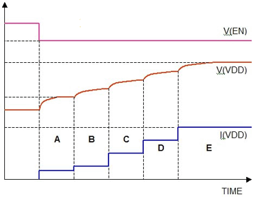 在A部分,通過限制流過分?jǐn)嚅_關(guān)的電流來減少負(fù)載電容充電時的浪涌電流;在B部分,升壓轉(zhuǎn)換器的開始電流限制在25%;在C部分,電流限制設(shè)在50%;在D部分電流限制為75%;在E部分,電流限制為100%。