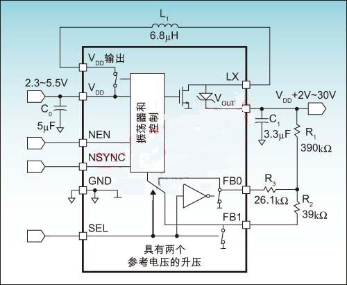 典型的反饋電壓是1.15V±2%。當(dāng)選擇引腳(SEL)設(shè)置為低時,F(xiàn)B0反饋引腳就與參考電壓進行比較,F(xiàn)B1引腳接地,用以提供反饋參考地。當(dāng)SEL為高時,F(xiàn)B1用作參考電壓,F(xiàn)B0接地。輸出電壓可用公式5和公式6計算: