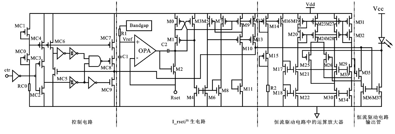整個控制模塊利用施密特觸發(fā)器實現(xiàn)電平的準確翻轉,通過邏輯門作用于MC8、MC9.這兩個MOS管在控制信號發(fā)生翻轉時迅速將電平拉高或拉低,實現(xiàn)了對控制信號控制功能的加速作用,電路的響應速度快。當ctr信號為高時輸出禁止,ctr信號為低時輸出允許,從而實現(xiàn)利用外部的PWM信號實現(xiàn)調光功能。I_rset產(chǎn)生電路要實現(xiàn)通過外設電阻Rset對I_rest大小的控制,并且對與固定的Rset可以恒流輸出。利用帶隙電壓源產(chǎn)生一個基準電壓,利用運放實現(xiàn)基準電壓到基準電流的轉換。將運放的反相端連接到外設電阻Rset就實現(xiàn)了轉換的電流大小受控于Rset.通過后續(xù)電路將電流適當放大,最終給出I_rset.總體電路利用確立好的恒流驅動模塊實現(xiàn)恒流輸出。