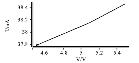 設置Rset為500Ω、Vcc為3V,令5V電源電壓產(chǎn)生±10%的波動,此時恒流輸出情況如圖5.驅動電流由37.8mA變化到38.5mA,波動百分比為1. 85%。