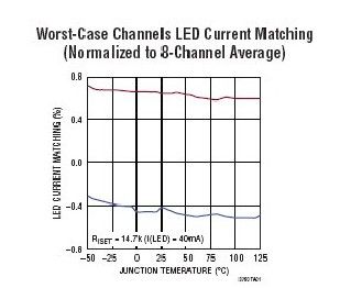 LT3760 采用自適應反饋環路設計,該設計調節輸出電壓以使其略高于 LED 串的最高電壓。這最大限度地減小了通過鎮流電路損失的功率,并幫助優化了效率。圖 2 中的電路提供高于 90% 的效率。這很重要,因為消除了任何散熱需求,從而實現了占板面積非常緊湊的扁平解決方案。就驅動 LED 陣列而言,同樣重要的是,提供準確的電流匹配,以確保在整個儀表板上保持背光照明亮度一致。LT3760 在 -40度 至 125度的溫度范圍內保證 LED 電流變化不到 ±2%,而且正如在圖 5 中能看到的那樣,它的典型值較接近 ±0.5%。