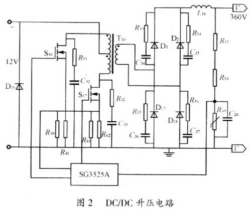 其工作原理為將升壓變壓器的中心抽頭接于正電源,兩路相反的PWM驅(qū)動脈沖送至開關(guān)管S16、S17的基極,從而控制兩只功率管交替工作,得到的方波交流電壓經(jīng)變壓器輸出,經(jīng)電感L16和電容濾波得到360V直流。電流檢測電阻(R41//R42)得到的電壓接到SG3525A的腳10來實現(xiàn)過流保護。R37、R38和R45為電壓采樣,構(gòu)成電壓負反饋,因而提高了電路的可靠性。SG3525A及控制電路的電源都來自蓄電池,D16為防反接二極管。DC/DC從12V蓄電池電壓升到360V直流電,供后級鎮(zhèn)流電路點燈。