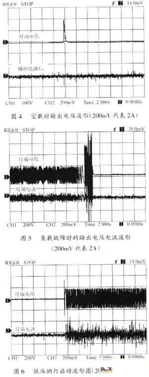在低壓鈉燈電子鎮(zhèn)流器中采用了新型的異常保護電路和短路保護電路。如圖4所示,在不接低壓鈉燈的情況下,在100ms的時間內(nèi)電源先啟動后關(guān)斷,其中通道1為低壓鈉燈電壓波形,通道2為半橋式逆變器芯片供電電源。在低壓鈉燈正常工作時,如燈突然斷開或接觸不良,即燈開路的情況下的波形圖,如圖5所示。同樣半橋式逆變器芯片IR2153供電電源斷開,半橋逆變器停止工作。圖5中通道l為低壓鈉燈正常工作電壓波形,通道2也為半橋式逆變器芯片供電電源。這樣不僅保護了MOSFET功率管不因嚴重發(fā)熱而損壞,而且還能在燈開路的情況下使半橋逆變器停止工作,節(jié)約電能。