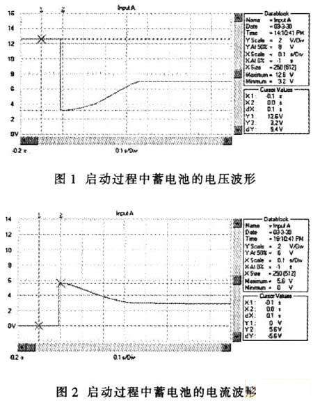 蓄電池是汽車中的關(guān)鍵電器部件,其性能直接影響汽車的啟動(dòng)。現(xiàn)在的汽車啟動(dòng)無一例外地采用啟動(dòng)電動(dòng)機(jī)啟動(dòng)方式。在啟動(dòng)過程中特別是在啟動(dòng)瞬間,由于啟動(dòng)電動(dòng)機(jī)轉(zhuǎn)速為零,不產(chǎn)生感生電勢(shì),故啟動(dòng)電流:I=E/(RM+RS+RL);其中:E為蓄電池空載端電壓,RM為啟動(dòng)電動(dòng)機(jī)的電樞電阻,RS為蓄電池內(nèi)阻、RL為線路電阻。由于RM、RB、RL均非常低,啟動(dòng)電流非常大。例如用12V、45Ah的蓄電池啟動(dòng)安裝1.9L柴油機(jī)的汽車,蓄電池的電壓在啟動(dòng)瞬間由12.6V降到約3.6V,啟動(dòng)過程的蓄電池電壓波形如圖1所示。啟動(dòng)瞬時(shí)的電流達(dá)550A,約為蓄電池的12C的放電率>啟動(dòng)過程的蓄電池電流波形如圖2所示。電流傳感器的電流/電壓變換比率為100A/V。盡管車用蓄電池是啟動(dòng)專用蓄電池,可以高倍率放電,但從圖l可以看出,10倍以上高倍率放電時(shí)的蓄電池性能變得很差,而且,如此高倍率放電對(duì)蓄電池的損傷也是非常明顯的。啟動(dòng)過程的電壓劇烈變化也是極強(qiáng)的電磁干擾,可以造成電氣設(shè)備掉電,迫使電氣設(shè)備在發(fā)電機(jī)啟動(dòng)過程結(jié)束后重新上電,計(jì)算機(jī)在這個(gè)過程中非常容易死機(jī)。因此,從改善汽車電氣設(shè)備的電磁環(huán)境、改善汽車的啟動(dòng)性能和蓄電池性能或延長(zhǎng)蓄電池使用壽命來考慮,改善汽車電源在啟動(dòng)過程中的性能是必要的。解決問題的方案之一是加大蓄電池的容量,但需要增加很多,并使其體積增大,這并不是好的選擇。而將超級(jí)電容器與蓄電池并聯(lián)可以很好地解決這個(gè)問題。