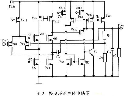 閉環控制系統的主體電路如圖2所示,VM1~VM8組成折疊式的誤差放大器,VM9~VM10組成單級的電流鏡作為負載,這樣做的好處就是采用10 pF左右的補償電容就可以使系統達到穩定。VM5~VM14和VQ組成級間緩沖級。R1和R2組成反饋網絡,其中