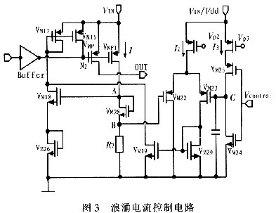 由上面分析可知,由于N2節點電壓迅速變化,導致大的浪涌電流流過P功率管(VMP管)。因此只需要控制N2節點電壓的變化就可以實現電流的控制,控制該浪涌電流變化無非就是控制其變化的斜率和峰值。其具體的電路原理圖包括兩個部分,即浪涌電流的斜率控制部分和峰值控制部分。具體的實現電路如圖3所示。