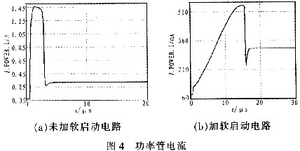 圖4為系統剛啟動時,流過功率管VMP管的電流,圖4(a)為沒有加軟啟動電路時,流過P功率管的瞬態電流,其峰值電流高達1.45 A。圖4(b)表明軟啟動電路分別從斜率和峰值成功地控制了瞬態電流,其峰值僅為520 mA,上升的斜率幾乎是一恒定值,不過這會增加系統的響應時間。因此可以根據應用系統的其他要求確定浪涌電流的斜率和峰值。