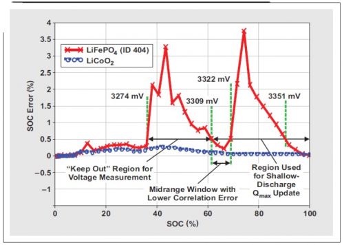 如表 1 所示,化學 ID 404 的 OCV 測量的不合格電壓范圍為 3274mV(最小值,即 ~34% SOC)到 3351mV(最大值,即 ~93% SOC)。大多數磷酸鐵鋰電池都有非常寬的不合格電壓范圍(參見化學 ID 409 進行對比)。然而,根據具體的電池特性,為淺放電 Qmax 更新找出一個更高的最小不合格電壓是可能的。化學 ID 為 404 時,將這一值升高至 3322mV 是可能的,從而允許 3309 到3322 mV 的淺放電 Qmax 更新窗口(請參見圖 2)。設計人員可以使用這種中間范圍低誤差窗口,實現數據閃存修改。由于僅能對高和低不合格電壓范圍進行設定,因此主系統必須保證在 3309mV 以下不會進行更低的 OCV 測量。(隨著關聯誤差的增長,OCV 測量誤差在 3274 和 3309mV 之間急劇增加。)雖然僅有一個 13-mV 窗口在更低 OCV 測量時起作用(3322 – 3309 mV = 13 mV),但其對應于一個 70% 到 64% 的 SOC 范圍。