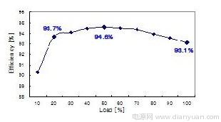 轉(zhuǎn)換器的效率如圖 7 所示,在額定負(fù)載為 20%、50% 和 100% 的情況下測得的效率分別為93.7%、94.6% 和 93.1%,這顯示了邊際性能,因而使用設(shè)計優(yōu)良的 PFC 和 DC-DC 級能夠達(dá)到85 PLUS 規(guī)范要求。