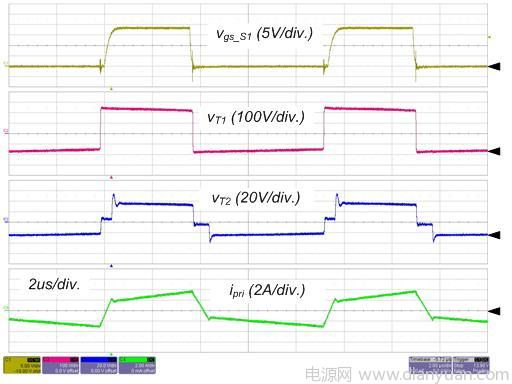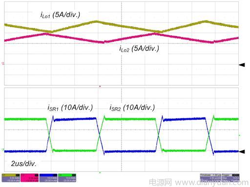 圖 4 和圖 5 所示為轉(zhuǎn)換器在標(biāo)稱輸入和全負(fù)載情況下的實驗波形。S1 的柵極信號,主變壓器的初級端和次級端的電壓和初級端電流如圖4所示。請留意這些波形與理論分析很好地吻合,包括ZVS 運(yùn)作。輸出電感電流和 SR 的電流如圖 5 所示,由于占空比和寄生組件,輸出電感電流是不均衡的,這意味著平均勵磁電流小于中心抽頭式配置(注 1)。