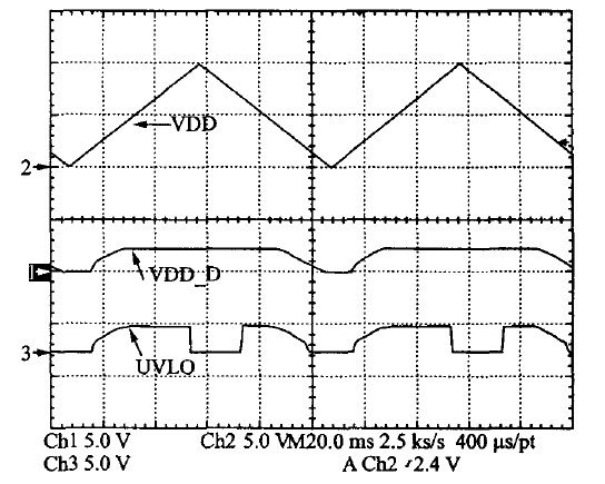 UVLO的啟動(dòng)電流測(cè)量值僅為17.8 A,實(shí)現(xiàn)了系統(tǒng)的低啟動(dòng)電流。系統(tǒng)上電和掉電的測(cè)試結(jié)果如圖11和圖12所示。可見(jiàn)系統(tǒng)在VDD的設(shè)置門(mén)限內(nèi)工作良好,REF-OK可以正確指示各個(gè)供電模塊正常工作。掉電過(guò)程正好相反。