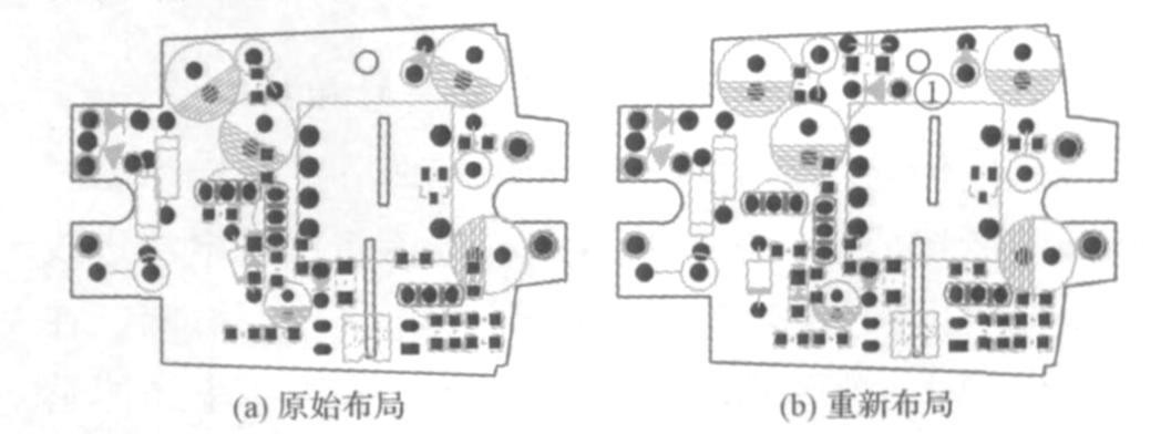 從圖4中可以看出在2 MH z頻率點附近最大超出為5 dBuV.為保證能夠順利通過認證機構的實驗室測試, 一般要求預測試結果比標準限制低2 dBuV,希望盡量能夠比標準限值低6 dBuV.所以從圖4可知該產品的預測試結果并不理想。初步分析測試圖,可能性最大的原因是開關管工作時產生的干擾把2MH z頻率點附近的噪聲電平底部懸空, 從而把傳導干擾的電平抬高。而在傳導發射測試中, 1 MH z~2MH z的頻率信號干擾是由共模電流產生的占主要分量[ 10] .所以初步定性為電流回路對參考地形成的干擾信號。為了能夠一次性解決問題以達到標準限值要求, 把可能出現問題的地方都加以改進, 本研究提出了解決方案: ①按照上述措施對線路板進行重新布局, 原始布局如圖5( a)所示, 圖中布局雖然按照主電流流向排布, 但缺乏考慮各個子路之間的相互關系。重新布局如圖5( b)所示, 在無法改變PCB板的結構下, 盡可能地將器件排列整齊, 方向一致, 同時增大開關管與變壓器之間距離。② 變壓器初級增加并聯旁路濾波電容, 并聯電容值為1 000 pF /1 kV, 用來降低干擾信號對共模電流回路產生的影響。