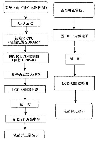 液晶顯示器啟動、關(guān)閉的測試流程圖如圖6。其中LCD控制器的初始化最為重要,須依照液晶顯示模塊的要求配置CPU的寄存器和延時時間。