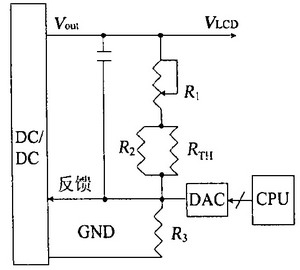液晶顯示器對比度的調(diào)節(jié)可分為硬件調(diào)節(jié)和軟件調(diào)節(jié)。圖5的電路具有軟、硬件調(diào)節(jié)功能。其中R1是可調(diào)電阻,可調(diào)節(jié)VLCD的電壓,從而液晶顯示器的對比度得到調(diào)節(jié);電路中還可利用CPU與數(shù)模轉(zhuǎn)換器(DAC)相結(jié)合來控制DC/DC的反饋端的電壓,從而實現(xiàn)軟件調(diào)節(jié)液晶顯示器的對比度。