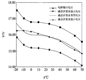 進行了模擬計算,結(jié)果如表1,由表1所得曲線如圖4。表1和圖4表明電路輸出和液晶屏的要求吻合,電路能夠保證液晶在-20~70°C 范圍內(nèi)正常顯示。而且高、低溫測試結(jié)果證實,在-20~70 °C范圍內(nèi)對比度正常。