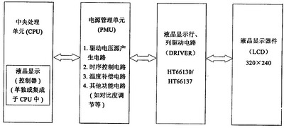 實現(xiàn)液晶顯示須具備4個單元,其框圖如圖1所示。本文給出的電源管理電路設(shè)計方案具有驅(qū)動電壓產(chǎn)生、時序控制、溫度補償和對比度調(diào)節(jié)的功能,其框圖如圖2所示。