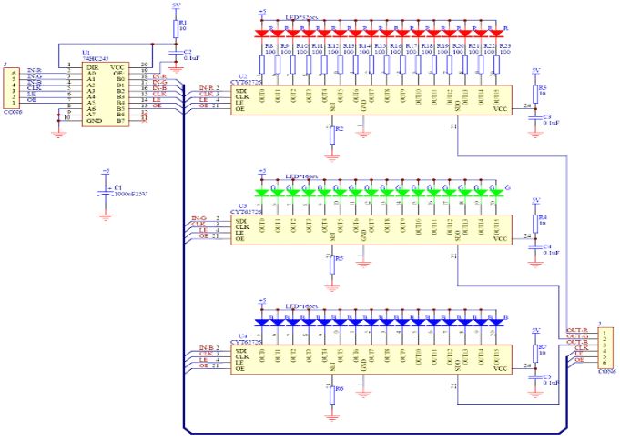 我們以一個led小模塊來分析其耗電狀況!如圖2,是一個以長運通光電推出的CYT62726為驅動芯片的led小模塊,其供電電壓為5V,先不計算外圍器件的功耗,因為它們在整個屏中所占的比重極小,那整個屏所耗的功率都在燈上,先計算燈點功率為Pled=n*Uvf*Iled(n為通道數,Uvf為led燈點的壓降,Iled為設定的電流值)CYT62726驅動IC的管腳壓降一般為0.6V左右,紅綠藍燈點的壓降分別為1.8V,3.0V,3.0V如此那每個通道只需4V(3.0+0.6V)即可正常工作,保守一點可以設置成紅燈通道2.8V,藍綠通道3.8V而實際上我們的供電電壓都為5V,就相當于增加了1V*Iled的功耗在IC內部,所以如上可以設想只要將供電電源下降至紅2.8V,綠3.8V,藍3.8V,我們就可以省去那加在IC通道上的1V*Iled功耗,在其他器件不變的情況下便可實現led顯示屏節能至少15%以上,再加上本身對led屏散熱要求的降低也能實現一定程度上的節能,這對于一個大屏來說已經是一個相當大的數字了,相信客戶會樂于接受!